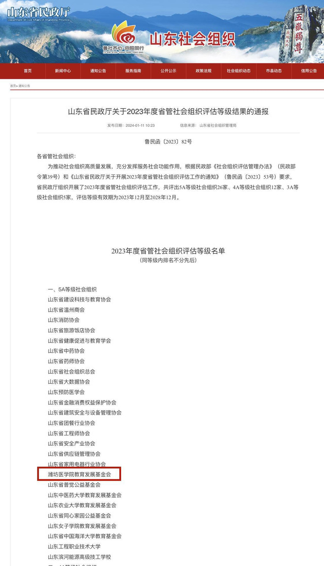 近日,山东省民政厅发布《关于2023年度省管社会组织评估等级结果的通报》,我校教育基金会获评最高等级“5A级社会组织”,等级评估有效期为5年。