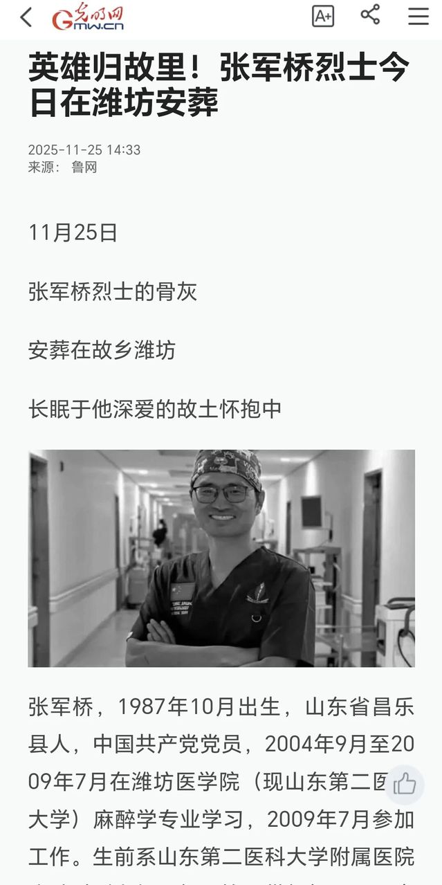 新华网视频号发布视频:“张军桥烈士安葬仪式在故乡山东潍坊举行。” 人民日报抖音号发布视频:“张军桥医生的骨灰安葬在故乡潍坊。斯人已逝,大爱永存。致敬!”