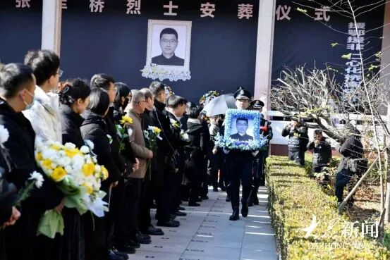 上午8时,送别仪式开始,两名礼兵缓步走进灵堂,轻轻整理覆盖着国旗的骨灰盒。张军桥的妻子祝琴含泪道:“军桥!我的爱人,一路走好。我会照顾好父母,抚养好孩子,让女儿知道爸爸是一位真正的英雄。”