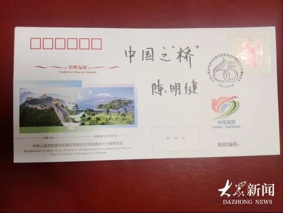 中国驻坦桑尼亚大使陈明健寄给张军桥夫人祝琴的明信片。