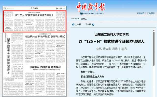 1月7日,《中国教育报》第8版以《山东第二医科大学药学院:以“125+N”模式推进全环境立德树人》为题,报道我校药学院在人才培养方面的特色做法,充分展现了学校在一流本科专业建设与人才培养改革中的突出成果。