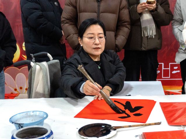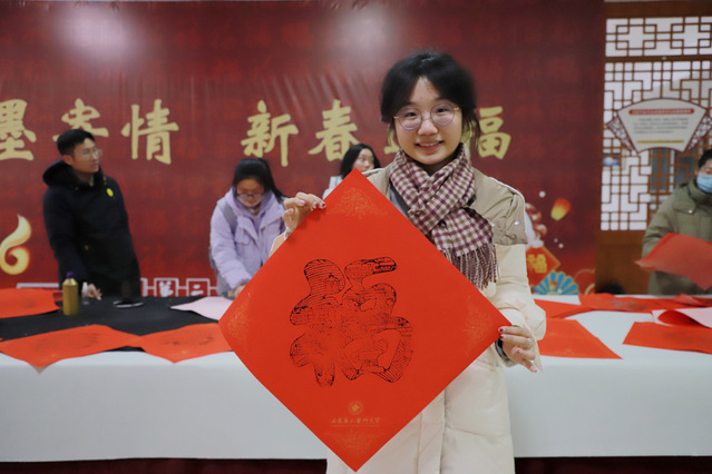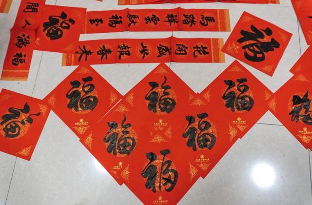 笔墨传情,福满校园。在“写福”环节,特邀“最美轮椅姐姐”刘晓清、学校离退休老干部书法爱好者、孔子学堂美育教师以及大学生书法美术协会的同学们现场挥毫。笔走龙蛇之间,一个个饱满的“福”字、一对对吉祥的春联跃然纸上,寄托着大家最真挚的祈愿。同学们也在老师的指导下提笔尝试,在氤氲的墨香中书写属于自己的新春祝福。