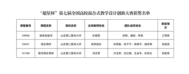 在“超星杯”第七届全国高校混合式教学设计创新大赛中,麻醉学院孙银贵教师团队的《临床技能学》课程获复赛三等奖,生命科学与技术学院欧阳旭东教师团队的《微生物学》和基础医学院刘志军教师团队的《医学微生物学》课程获优胜奖。该项赛事已纳入中国高等教育学会《全国普通高校教师教学竞赛分析报告》和《全国普通高校教师教学发展指数》数据统计源,旨在促进高校深化教育教学改革,推进课程改革与创新,300多所高校的近1300门课程进入全国复赛,覆盖了全部学科门类。