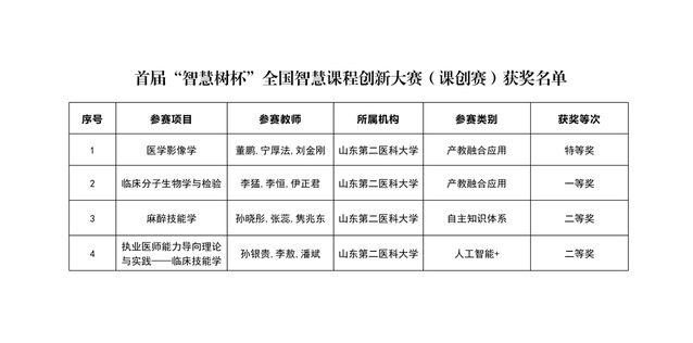 在首届“智慧树杯”全国智慧课程创新大赛(课创赛)中,医学影像学院董鹏教师团队获特等奖,医学检验学院李猛教师团队获一等奖,麻醉学院孙晓彤和孙银贵教师团队获二等奖。比赛以推动高校智慧课程创新建设、深化产教融合实践为核心目标,吸引了来自全国30个省份、近400所院校的教师及教学团队参加,是国内高校课程改革领域具有一定权威性与影响力的赛事之一。