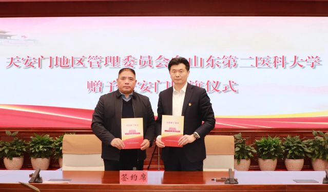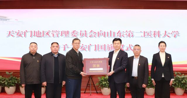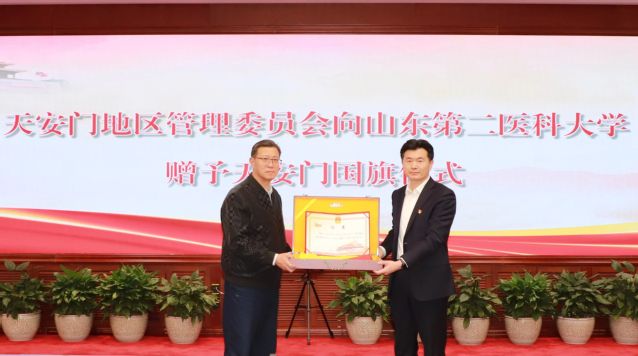 天安门地区管委会党组成员、副主任姚辉赠予国旗,管委会二级巡视员郭文龙与学校党委副书记徐杰签署国旗赠予协议,副校长田玉胜参加活动。