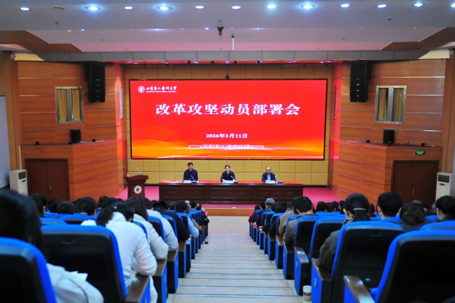 张建华作动员讲话。他强调,改革攻坚动员部署会主题明确、导向鲜明,今年工作的重心就是“改革攻坚”。他围绕锚定高水平医科大学建设目标,对标对表省属一类高校高质量发展绩效考核指标,持续推动学校事业高质量发展提出要求。一要进一步认清形势、解放思想,在把握大局中找准发展方位。一是清醒认识,深刻把握“不进则退、慢进亦退”的竞争态势。在新的发展赛道上,我们绝不能有歇歇脚、松口气的思想,而要切实增强危机意识、竞争意识、责任意识,破除惯性思维,以归零的心态重新出发,站在全国、全省层面定目标,跳出“舒适区”谋发展,以超常规举措面对新阶段、展现新姿态、谋划新发展。二是审时度势,准确把握“机遇叠加、挑战并存”的发展大势。从宏观层面看,高等教育高质量发展相关政策为学校争取支持、推动发展提供了更为广阔的空间;从区域发展看,面对各高校激烈的竞争,我们必须奋起直追,必须真抓实干;从自身基础看,制约学校发展的一些瓶颈问题需要我们以更大的决心和勇气推进改革,聚焦关键领域和薄弱环节攻坚突破。三是解放思想,坚决破除“因循守旧、路径依赖”的思想藩篱。要摒弃“等靠要”的依赖思想、“固步自封”的狭隘思想、“求稳怕乱”的保守思想,树立主动作为、勇于创新的意识,以想到不敢再想的力度解放思想,以干到不能再干的力度开拓工作,以抓到不用再抓的力度落实责任,真正把思想统一到“不改革就没有出路、不攻坚就无路可走”的认识上来。二要进一步明确目标、改革攻坚,在重点突破中提升发展能力。今年是“改革攻坚年”,学校高质量发展要锚定高水平医科大学建设目标,创先争优、争先进位。一是坚持立足当前与谋划长远相结合。要将“十五五”发展规划与今年重点任务置于国家发展战略和区域经济社会发展需求的大局中考量,将九大攻坚行动及具体任务细化分解成各部门和学院的“必答题”,确保每一项工作都要“接得住、落得实、见真效”。二是坚持问题导向与目标牵引相结合。改革要敢于刀刃向内,深入剖析影响学校高质量发展的体制机制障碍和各类矛盾问题,精准制定改革措施。要聚焦高质量发展绩效考核指标,集中力量定点攻坚,以关键领域的突破带动学校发展的整体跃升。三是坚持系统协同与特色发展相结合。要强化系统思维,打破部门壁垒和学科边界,加强协同联动。要有所为、有所不为,集中优势资源,着力在内涵建设、特色发展、开放办学上寻求突破,做到特色更特、优势更优,打造叫得响、有辨识度的山二医品牌。三要进一步真抓实干、担当尽责,在狠抓落实中务求发展实效。一是强化责任落实。学校要与各部门、各单位签订《改革攻坚目标责任书》,将考核任务分解到部门、落实到学院、传达到个人。各单位第一责任人要主动思考工作、主动领取任务、主动抓好落实,确保事事有人管,件件有着落。二是强化工作督导。建立常态化督导调度机制,强化工作督导和纪律督导,所有攻坚任务实行分类督导推进,形成“双周调度、月度盘点、半年考评”工作闭环,促进工作提速提质。三是强化考核评价。出台学校内部治理各项改革方案,遵循“多劳多得、优绩优酬”的原则,坚决打破“大锅饭”,坚决制止“混日子”,坚决处理不作为,真正将考核评价考出压力、考出动力、考出活力。